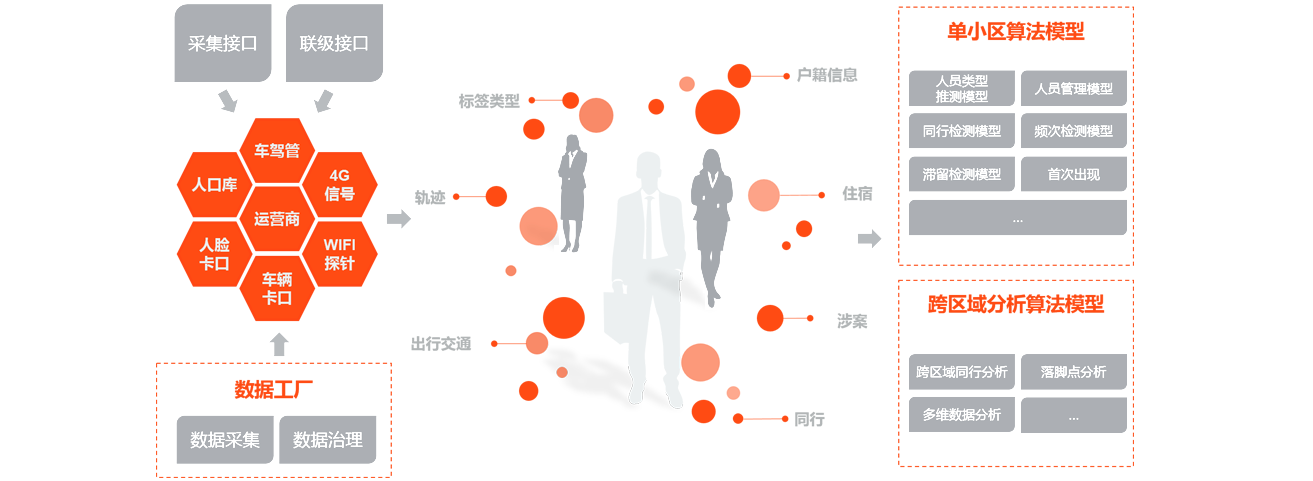 多维识别解析能力,产生的数据并轨分析,数据流动,动态闭环,整合并梳理成精细的人员全息画像,精进人员信息颗粒度,更好地服务人员动态管控工作